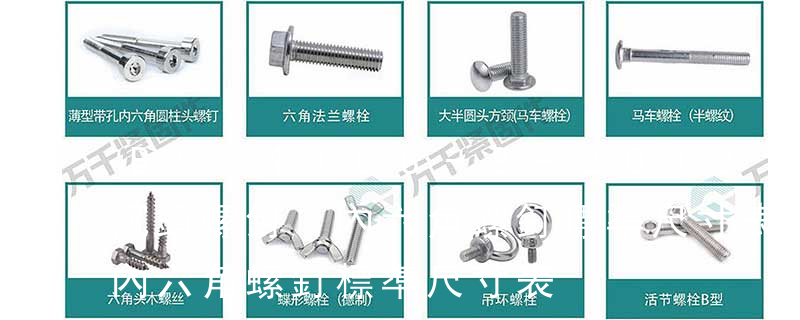 BS 4168《內六角螺釘和板手.米制系列》,我們國家的內六角螺釘和板手的標準是分開的:GB/T 70.1-2008 內六角圓柱頭螺釘 GB/T 70.2-2015 內六角平圓頭螺釘 GB/T 70.3-2008 內六角沉頭螺釘 GB/T 5356-2008 內六 螺栓有:1、方頭螺栓,2、半圓頭方頸螺栓,3、十字槽盤頭螺釘,4、內六角沉頭螺釘,5、方螺母C級,6、蝶形螺母,7、六角頭螺栓,8、十字槽盤頭自攻螺釘。大小有M18、M6、M8、M16、M10、M12、M14、M20等型號。通常用